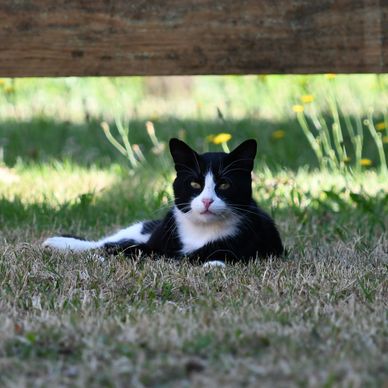 This lovely boy just turned up one day at the sanctuary, and has continued to turn up every day since - he looked a little skinny so we started to feed him, and is now becoming a part of the cat gang. We estimate he must be quite young, no more than 2, its wonderful to watch him play and chase his tail, he's getting braver and while we still can't stroke him, we're hoping we can build his trust with treats and slow blinks. We called him Sylvester because of his resemblance to the cartoon character :)