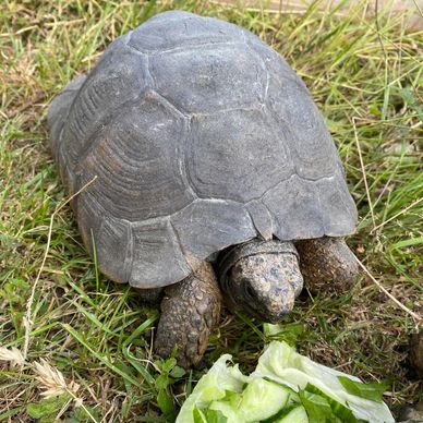 Basil is estimated to be 100 years old! Originally found 30 years ago wondering in a national forest in the UK, Basil moved to France with his expat parents and had a very happy life. Very sadly his mother figure passed away last year and his father figure is no longer able to care for him alone. He was brought to us after his owner saw our sanctuary online and that we already had tortoises, and they don't think Basil had ever met another of his kind! But he has settled in perfectly and is a wonderful companion for Joey and Wilson.